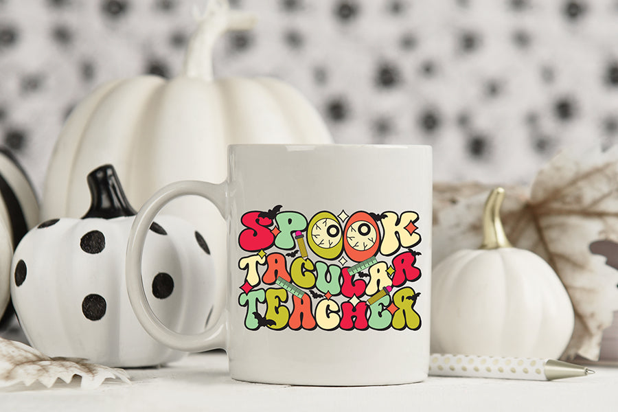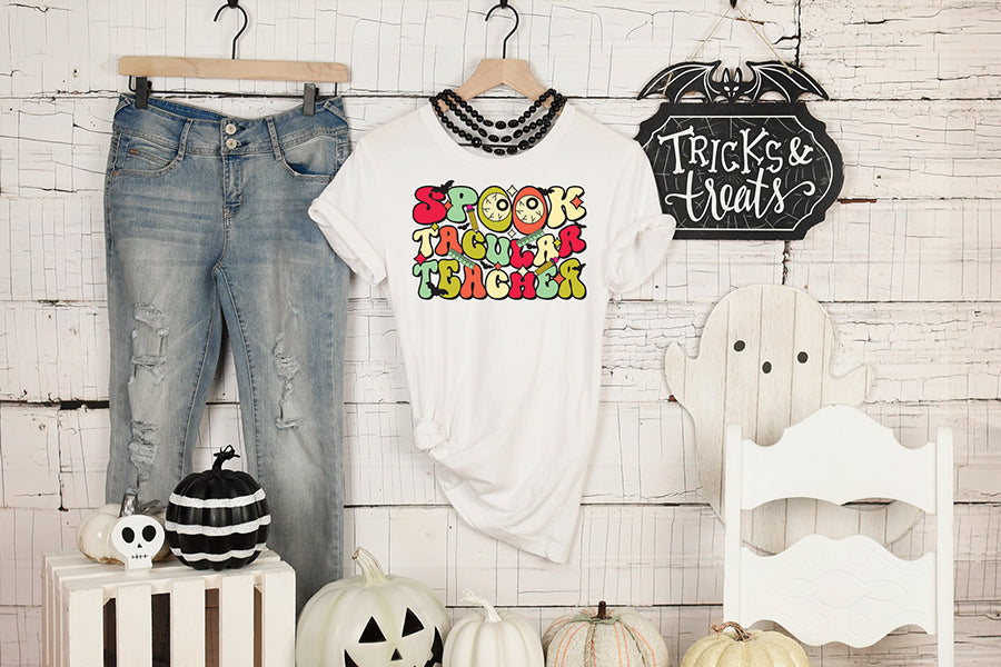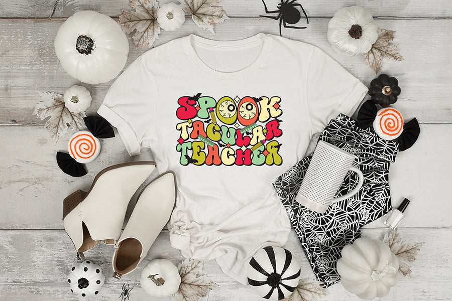 Elevate your teaching space this Halloween with our vibrant and captivating Teacher Sublimation design. Get ready for a ghoul-tastic classroom experience! Use it for creating t-shirts, mugs, tote bags, pillows, and more!