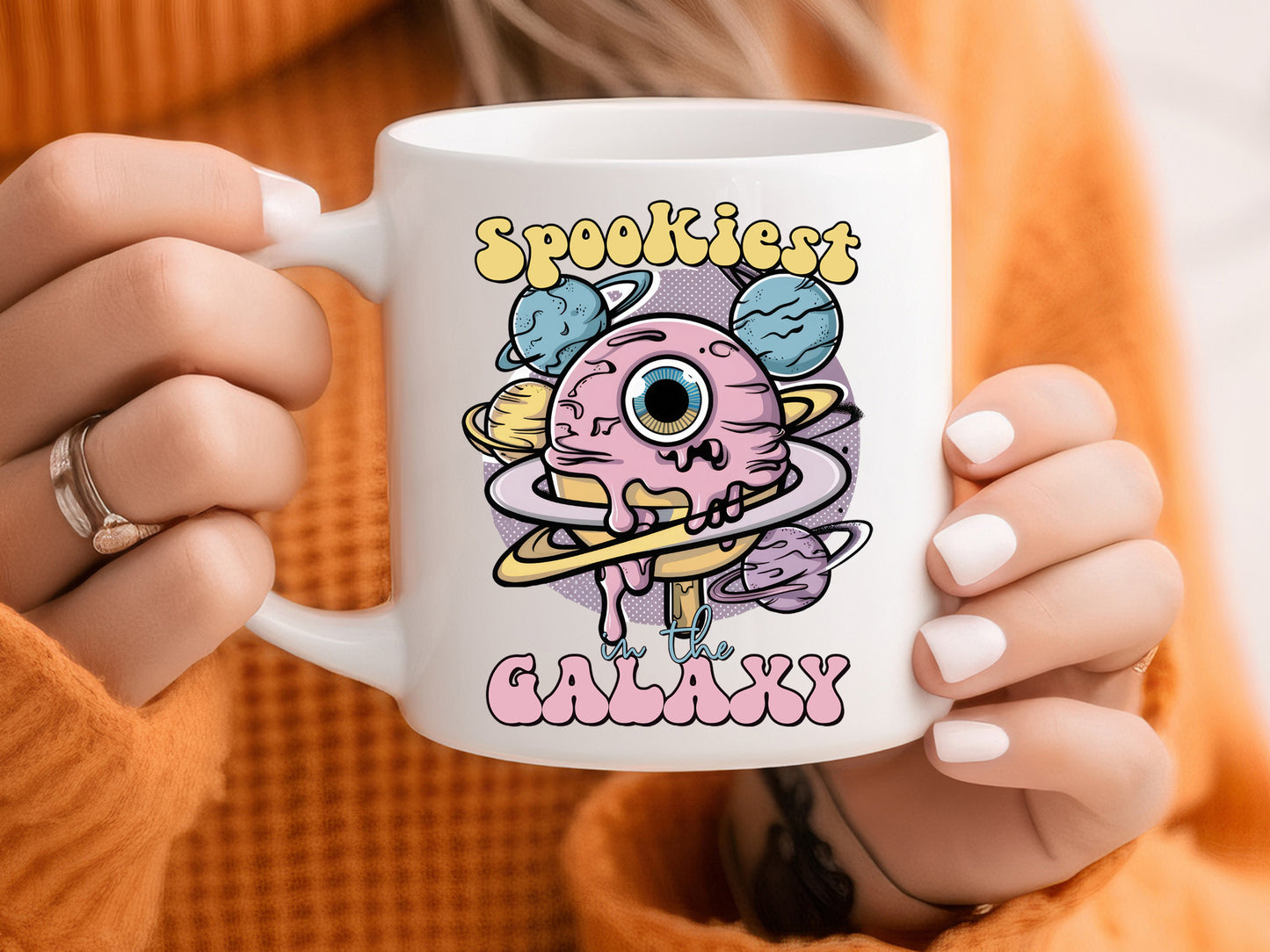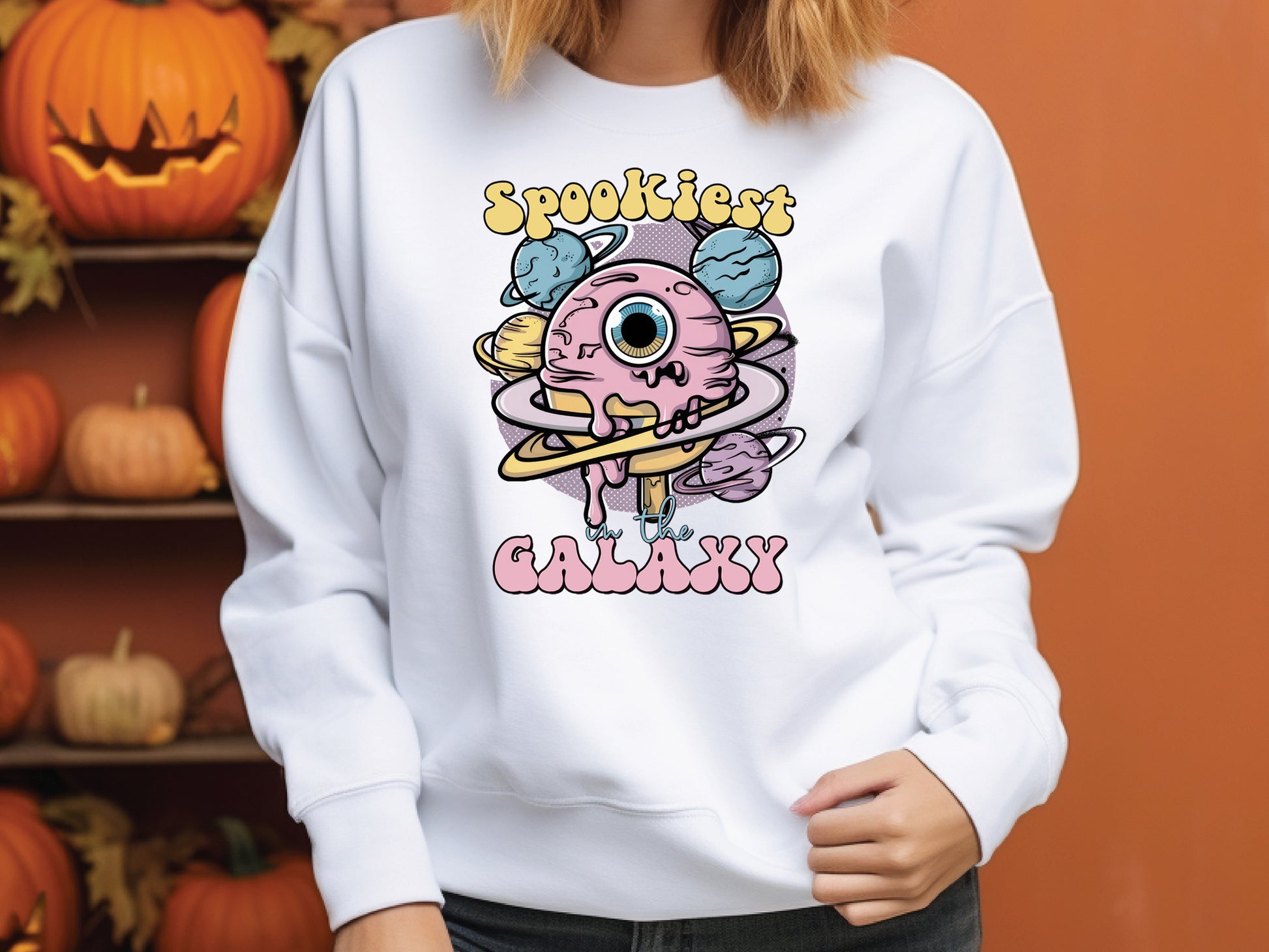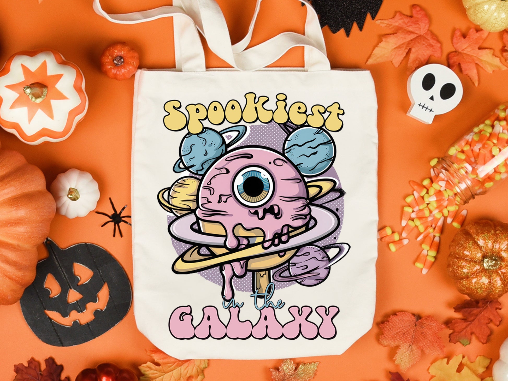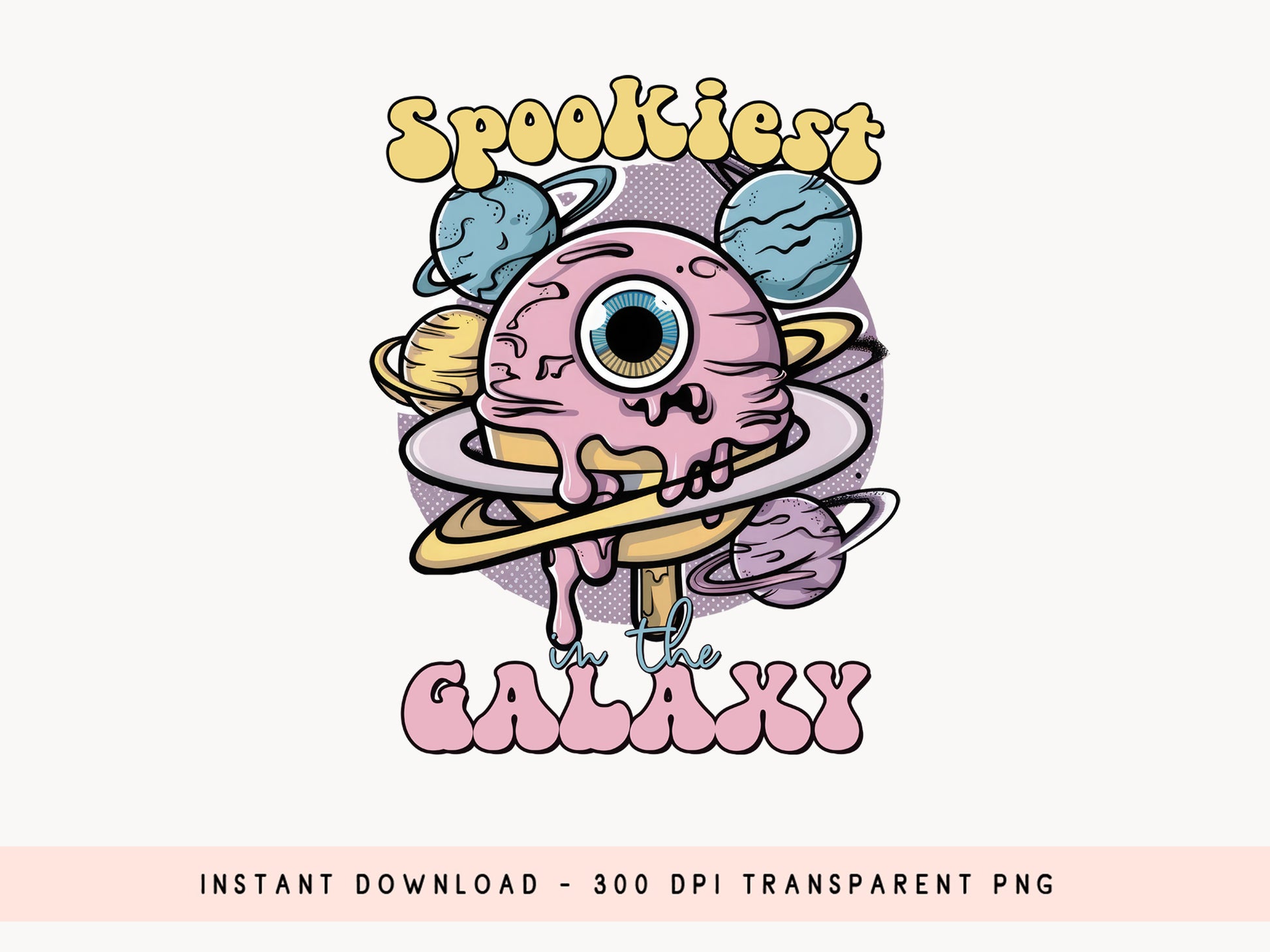 Purchase the "Spookiest in the Galaxy - Pink Halloween PNG Sublimation", an enchanting and whimsical product perfect for adding a touch of pink to your Halloween project. It features a pink ice cream cone dripping purple goo, resembling an eye, surrounded by planets and stars. Suitable for a variety of creative projects, this Pink Halloween PNG sublimation design can be used on t-shirts, mugs, tote bags, sweatshirts, and any other physical products. The design is made for sublimation applications or regular printing. With its high-quality resolution and eye-catching graphics, make it a versatile choice for those looking to celebrate Halloween in style. Get the "Spookiest in the Galaxy" design today!