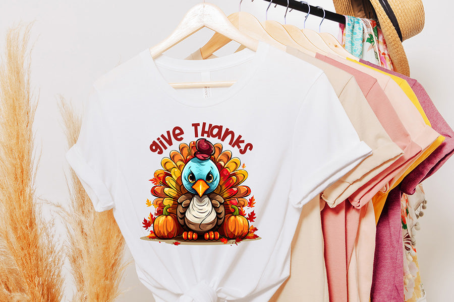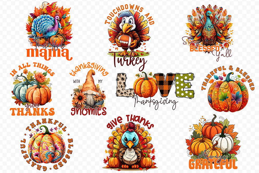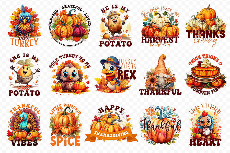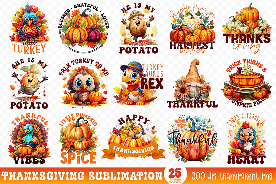 Introducing the Thanksgiving Sublimation Bundle Vol 3. This unique collection features 25 vibrant and eye-catching designs, perfect for adding a touch of thanksgiving to any project. These designs are ideal for creating t-shirts, mugs, tote bags, pillows, and much more!