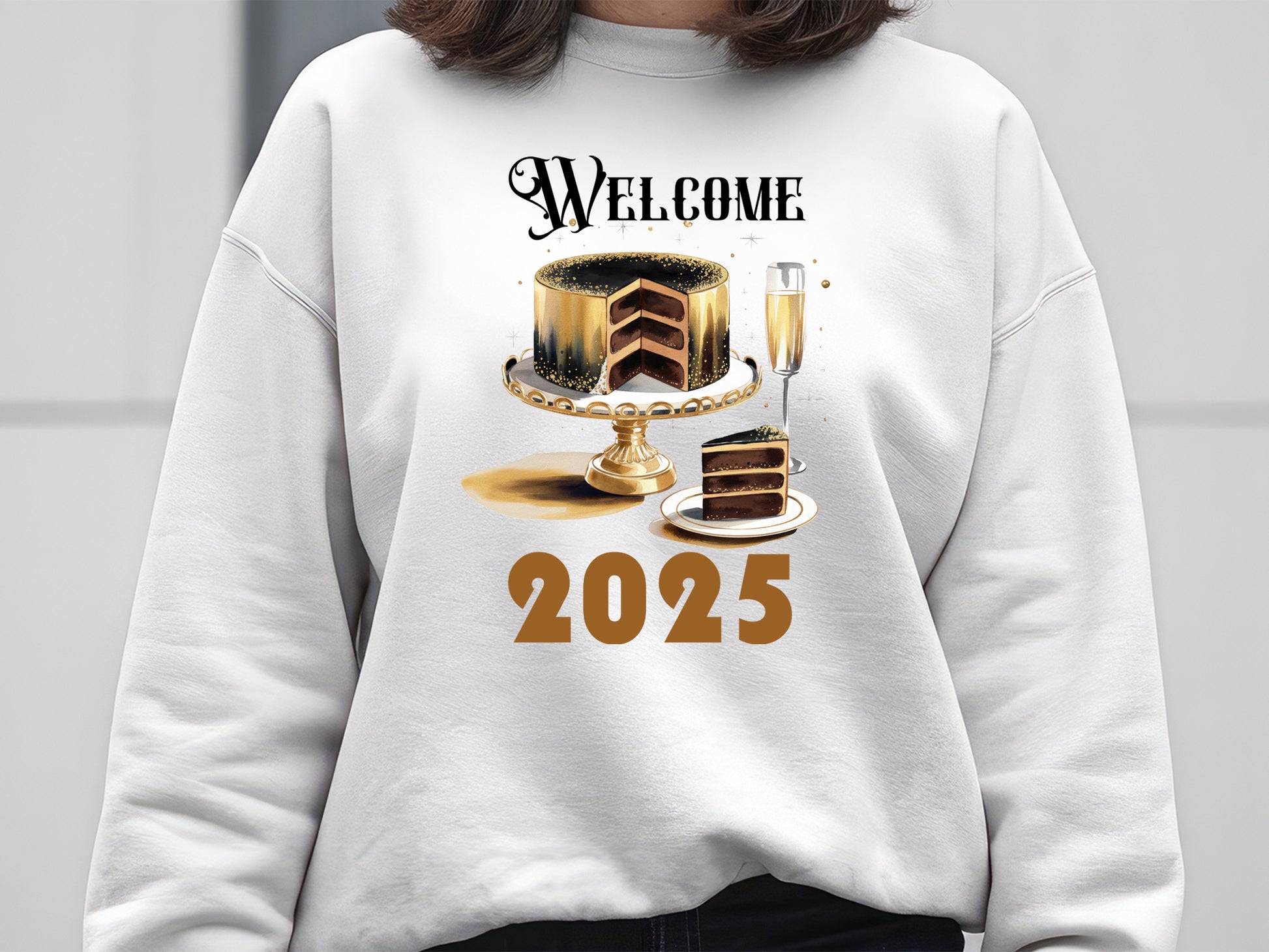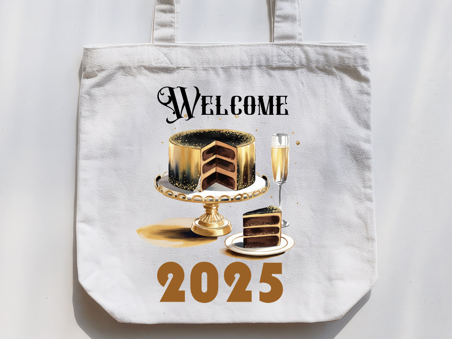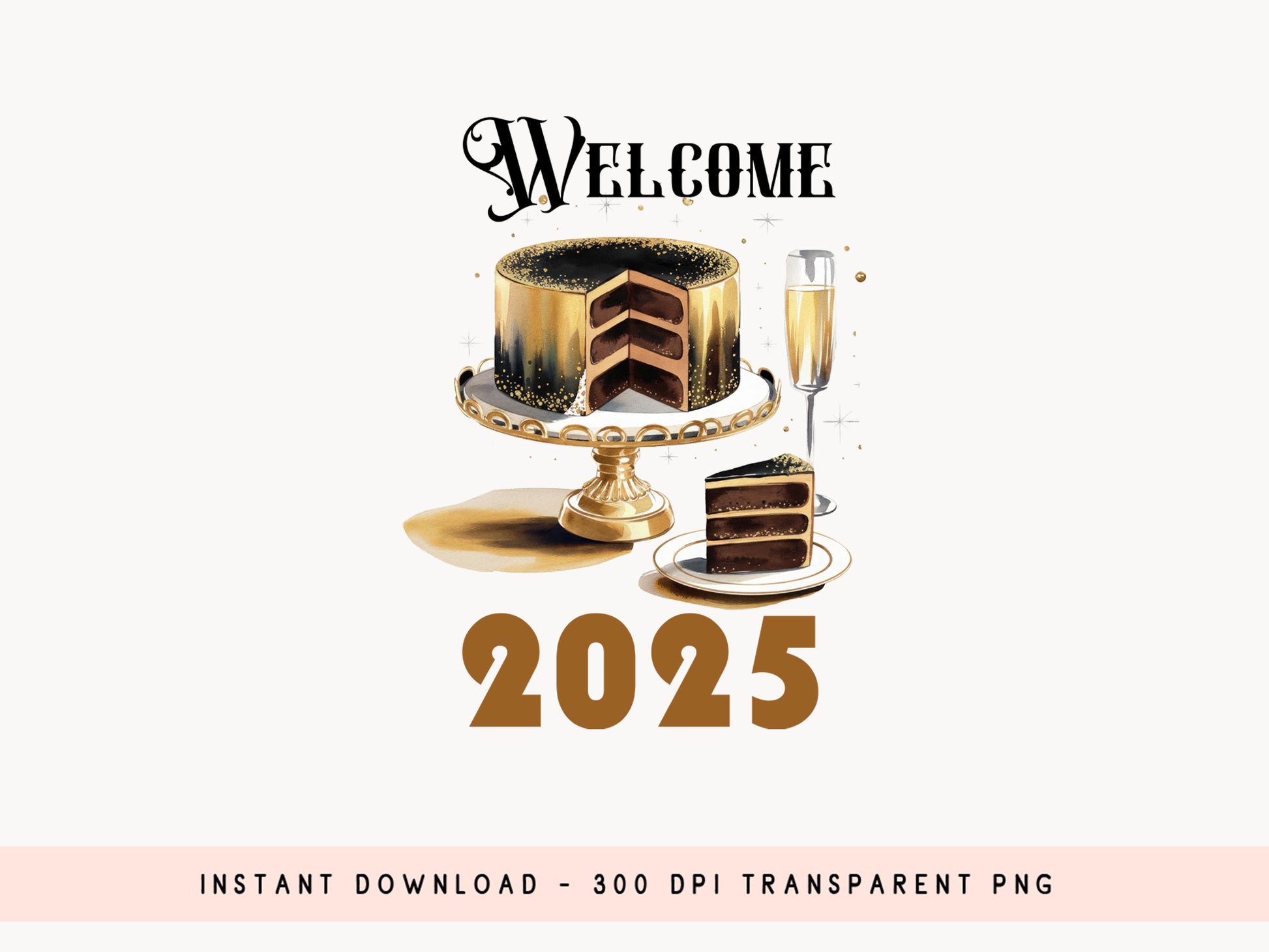 Welcome the New Year with joy using the "Welcome 2025 - Happy New Year" sublimation design! Perfect for adding a festive touch to your t-shirts, mugs, tote bags, sweatshirts, and party decor. It includes a variety of illustrations such as a luxurious chocolate cake with gold accents and a champagne glass that will elevate your upcoming New Year's Eve projects. With vibrant colors and eye-catching illustrations, it is perfect for stunning sublimation projects. Looking to create heartwarming keepsakes for loved ones, this Happy New Year Sublimation Design is an ideal choice and brings the celebration to any New Year’s project. Grab now!