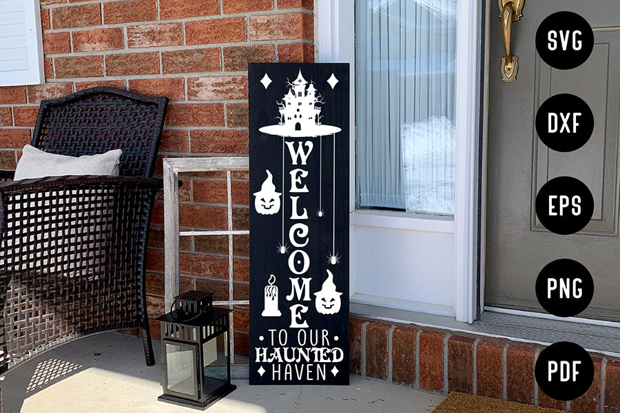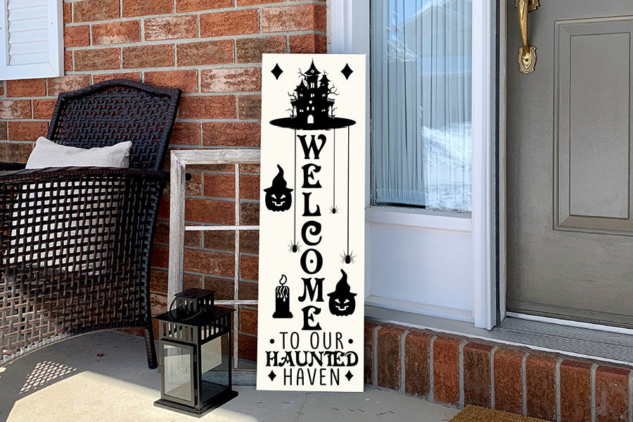 Welcome Halloween spirits in style with our spooky porch sign SVG design. Transform your porch into a festive and eerie display. Perfect for creating porch / vertical signs, welcome signs, wall decals, outdoor signs, farmhouse signs, home signs, and much more.