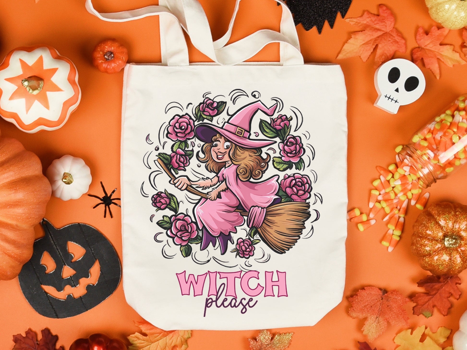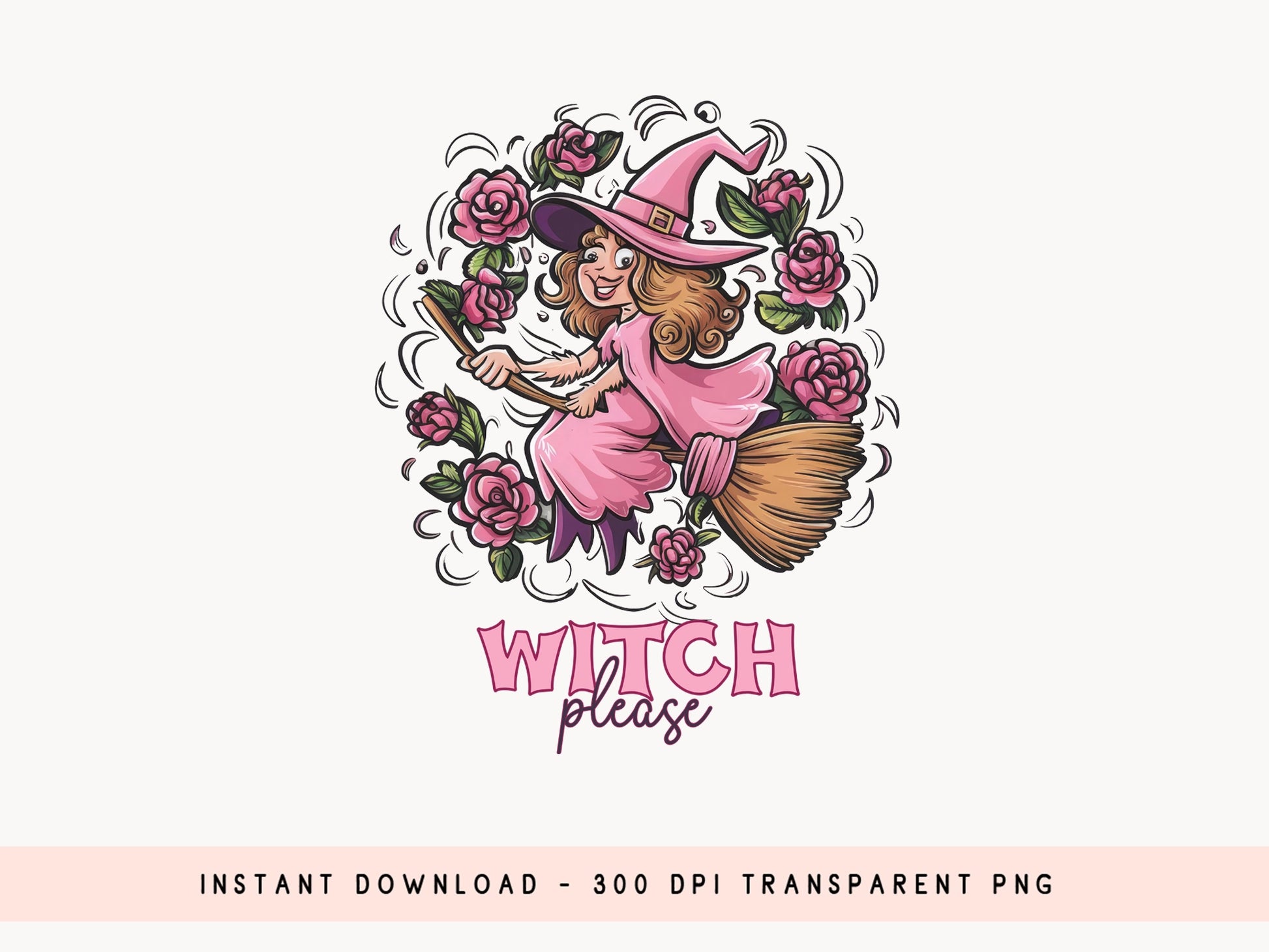 Shop our "Witch Please - Pink Halloween Sublimation Design", a vibrant graphic for taking your projects to the next lave! This adorable "Witch Please" design features a cheerful witch riding a broomstick and surrounded by a wreath of pink roses that's perfect for those who love to add a little attitude to their spooky season. Ideal for making trendy sweatshirts, t-shirts, tote bags, mugs, and more, this Pink Halloween Sublimation will bring a chic and fierce vibe to all your Halloween projects. Unleash your creativity and make personalized gifts using this versatile, high-resolution design. It's a must-have item for DTF and sublimation transfer projects. Don't miss out - grab this sublimation design today!