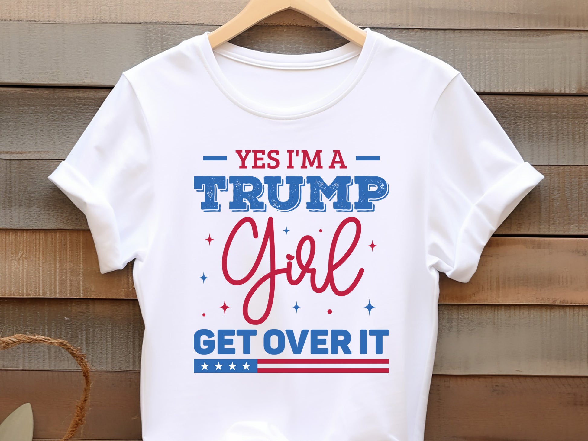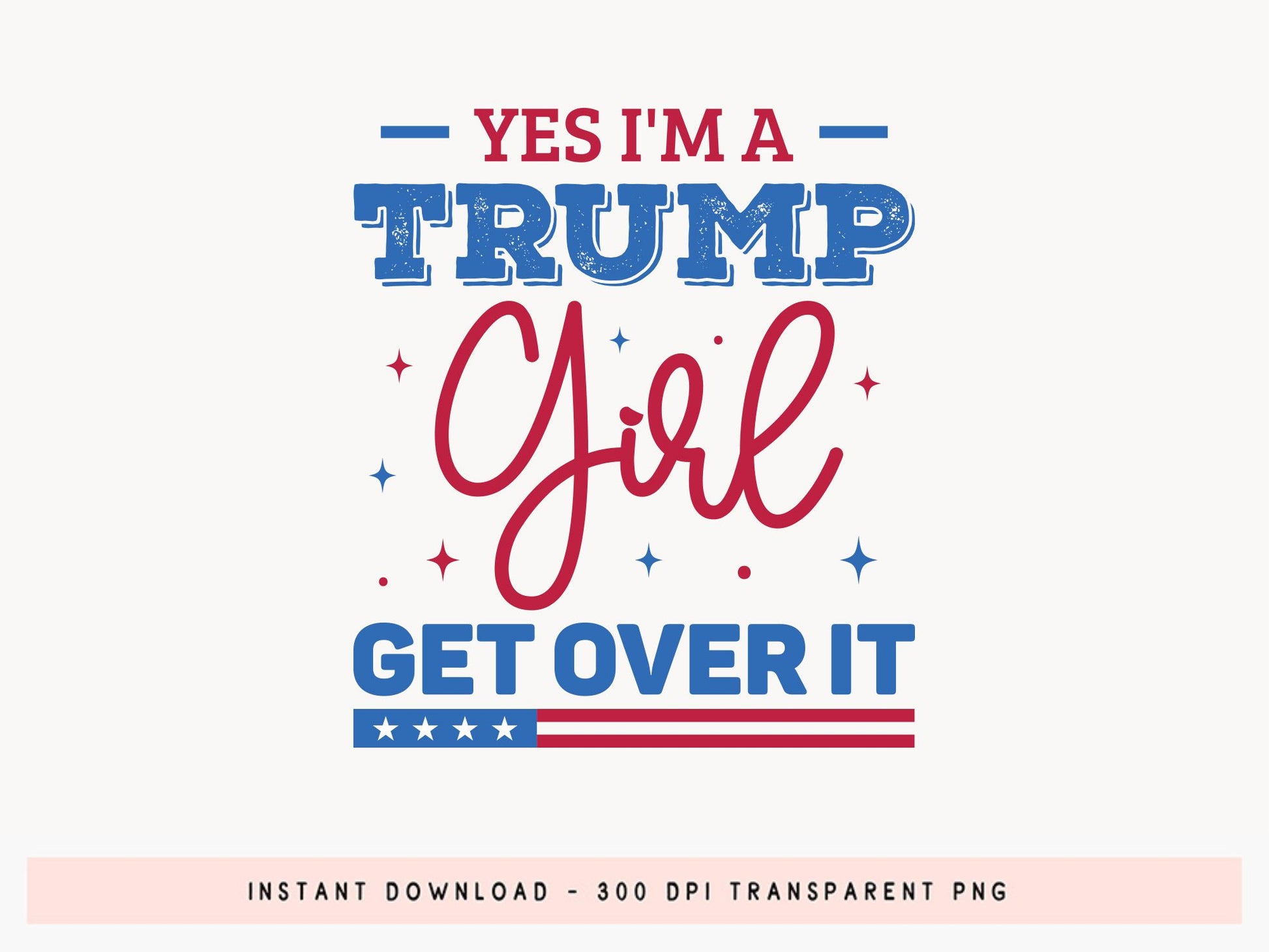 Download the Yes I'm A Trump Girl Get Over It Sublimation Design, a sassy and unique graphic suitable for creating unique t-shirts, mugs, tote bags, and more. With its high-quality resolution and elegant typography, it’s a fun way to express your support for Trump with confidence and flair. Whether for rallies, everyday wear, or as a gift for like-minded friends, this "Yes I'm A Trump Girl Get Over It" design is sure to stand out. Add a touch of personality to your projects and let everyone know you're a proud Trump supporter with this vibrant Trump Sublimation Design! Buy now and show off your political pride.